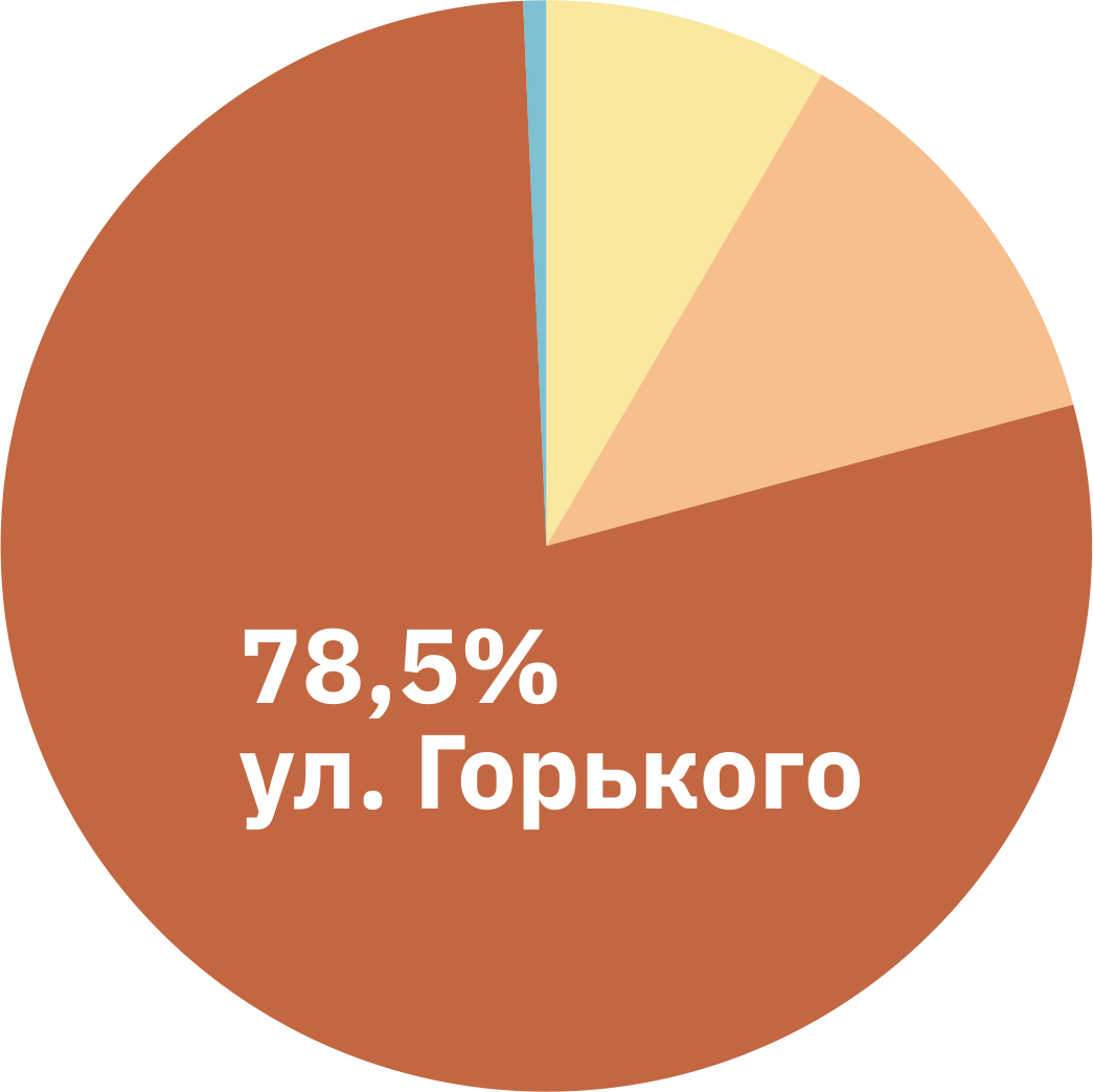 Исторический сквер — 359 голосов — 8,4 % Дендропарк — 529 голосов — 12,4 % Улица Горького — 3347 голосов — 78,5 % Другое — 29 предложений — 0,7%