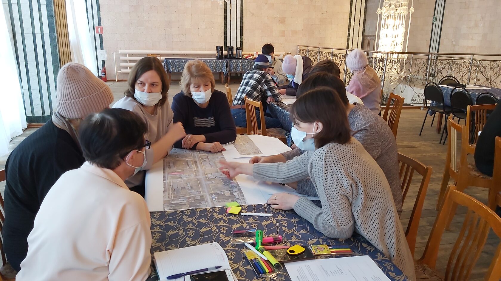 Участники проектной встречи в небольших группах отметили на схемах улицы проблемы и потенциал территории, предложили варианты по её функциональному наполнению, а затем обсудили между собой представленные идеи.